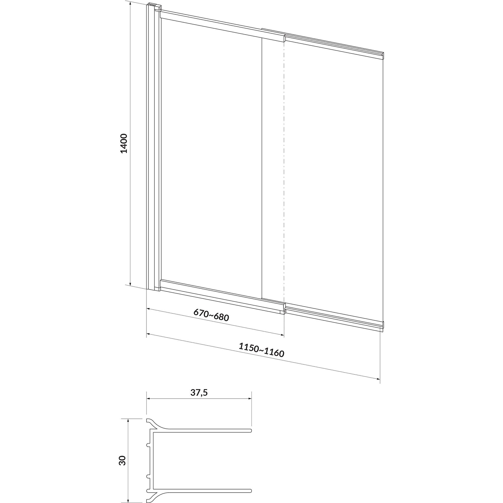 Vaňová zástena LARGA čierna dvojkrídlová 140x115 s priehľadného skla