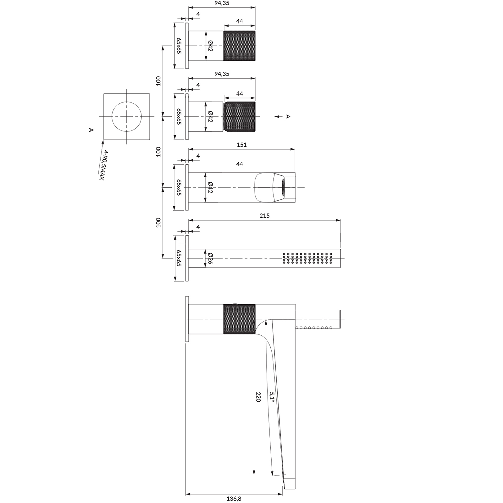 Kohútik vo vani CONTOUR 4-dierkový brúsený antracit.