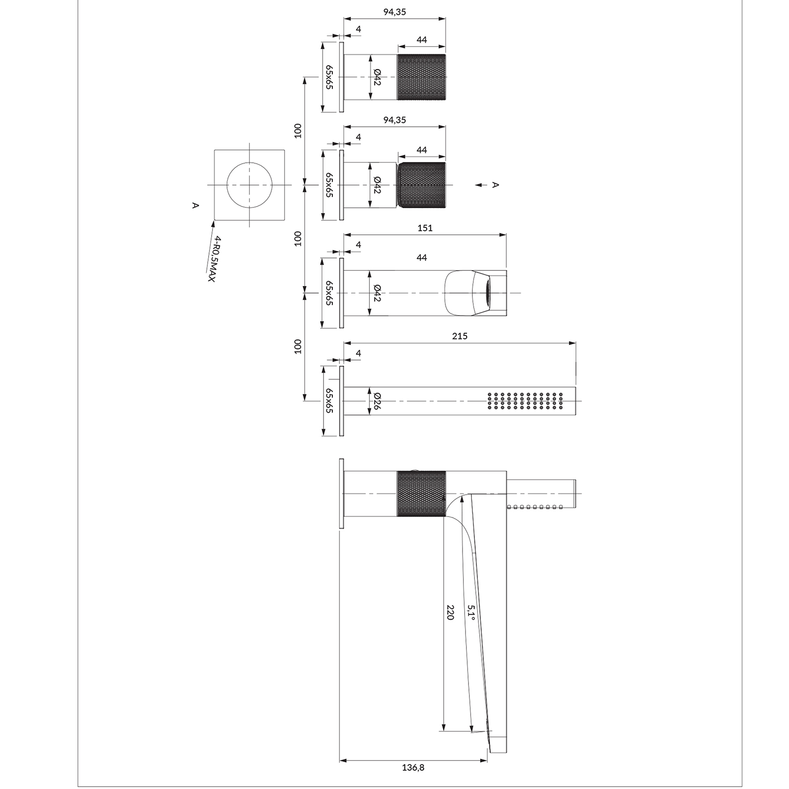 - Mosadzná sprchová rukoväť,