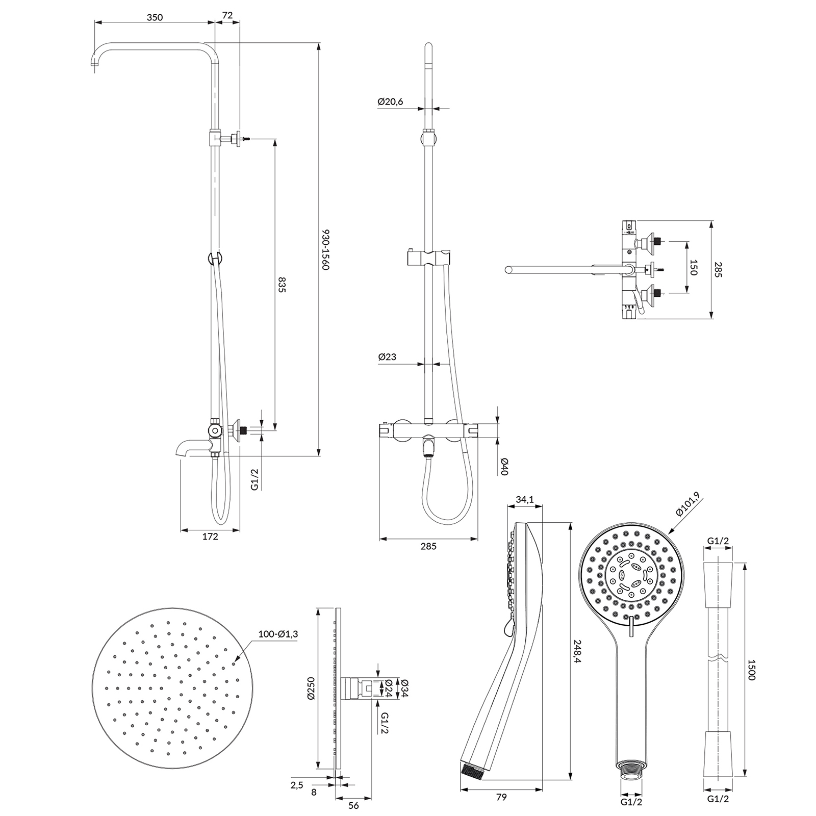 - mosadzná dažďová sprcha (WG125CR), veľkosť: Ø25 cm, dosah od steny: 42 cm
