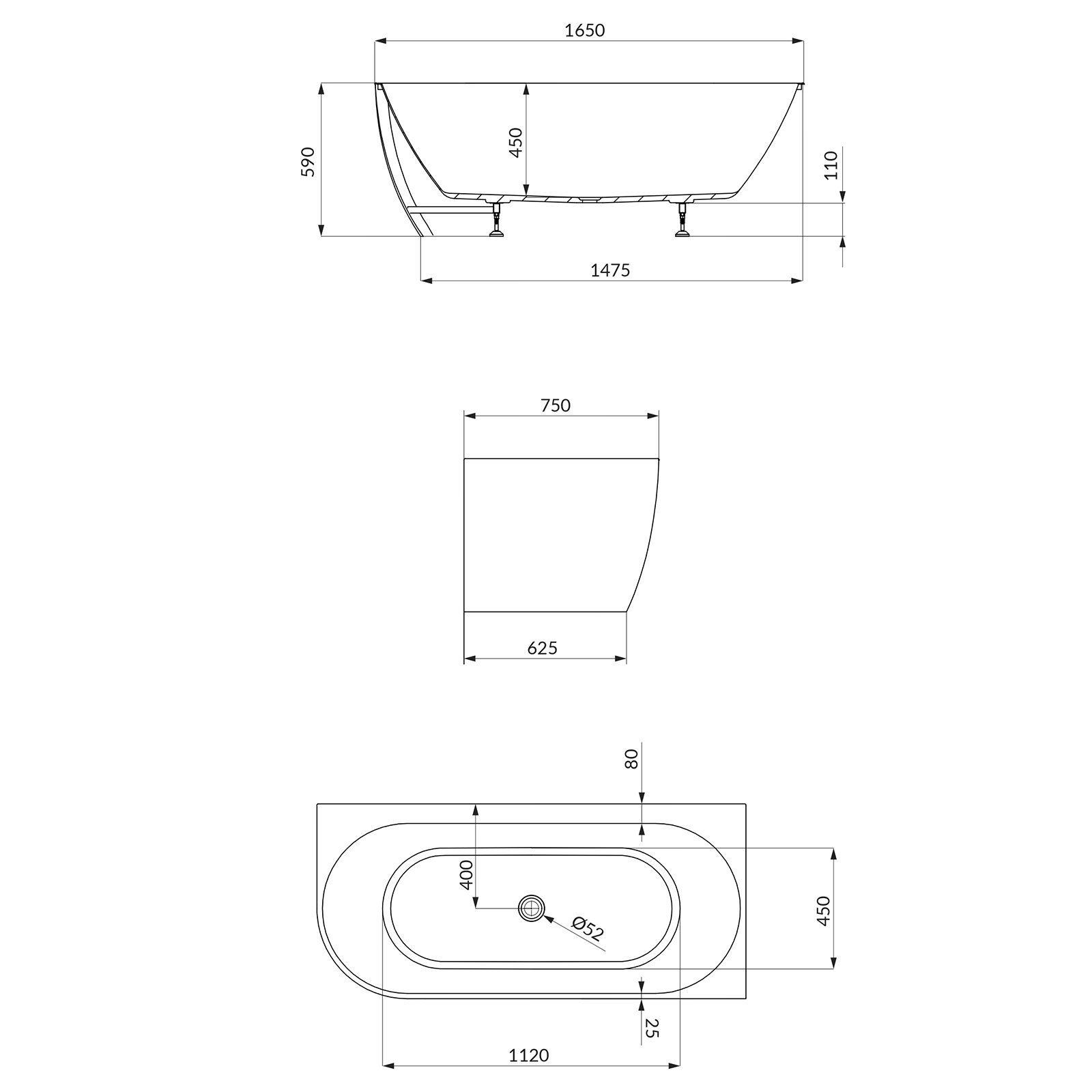 Voľne stojaca vaňa GARDA roh vpravo biely 165x75.